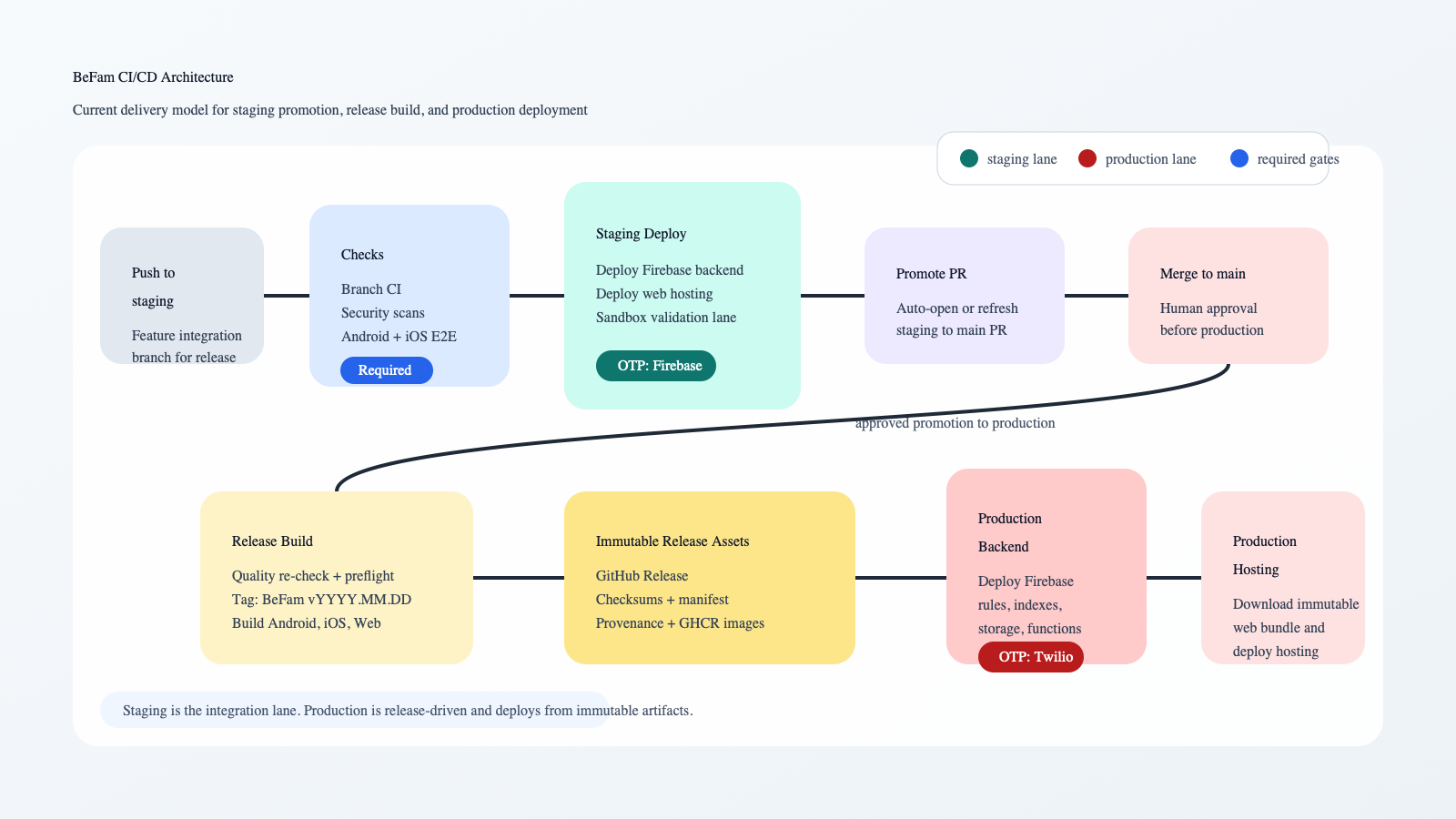 This page captures the current BeFam delivery architecture as implemented in GitHub Actions.